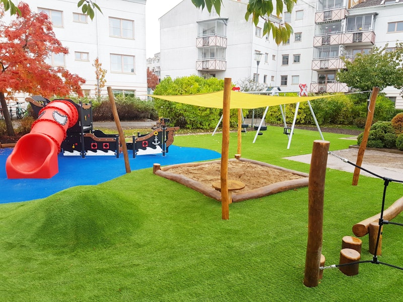Våra piratskepp fungerar bra i kombination konstgräs och produkter i Robiniaträ och andra träslag. Här bilder från ett av våra projekt åt en bostadsrättsförening i Nacka. En stor fördel med "temalek" i form av exempelvis båtar är att barnen får utlopp för sin fantasi och kan leka olika typer av rollekar. Denna typ av lek utvecklar barnens sociala förmåga och möjligheten till att träffa nya vänner ökar!